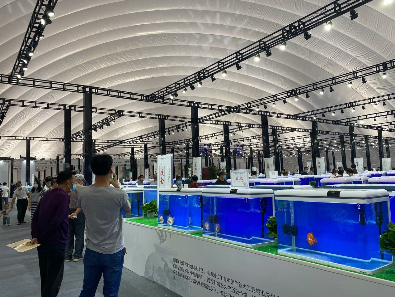 本屆大賽以“金波魚影琉光璃彩”為主題,賽期為8天,從9月6日至13日,與第二十屆中國(淄博)國際陶瓷博覽會同期舉行,“魚與琉璃”同館亮相,大賽展位面積近4000平方米,25個參賽組別,來自福建、廣東、北京、上海、江蘇、山東等17個省市的150余家單位及個人,近2000尾金魚驚艷亮相。