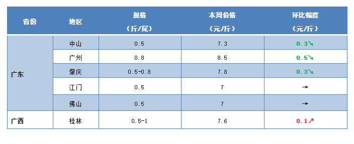 廣東:本周廣東地區的鯽魚行情整體呈現小幅下滑的勢頭。據養殖戶介紹,目前肇慶地區半斤的鯽魚最新塘頭價賣7.8元/斤,較之前下滑了0.4元/斤;中山地區半斤的鯽魚最新塘頭價賣7.5元/斤,較上周也是有0.3元/斤的下滑。不過流通商表示,目前鯽魚比較好賣,預計不會有太大的下滑。