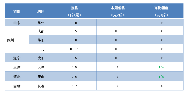 華北地區:本周華北地區的鯽魚行情出現明顯下滑。從養殖戶了解到,目前河北天津、唐山等地半斤的鯽魚最新塘頭價賣到6元/斤,較之前下滑1元/斤。