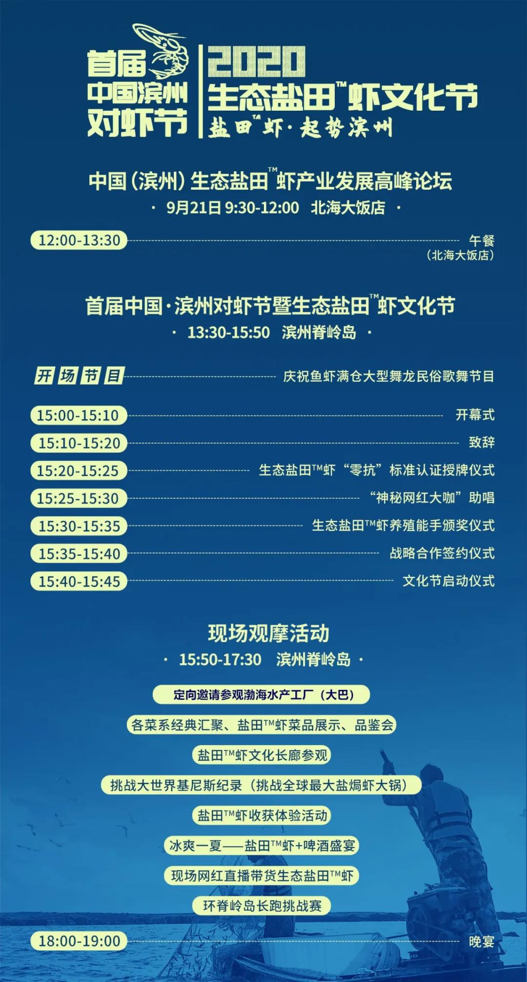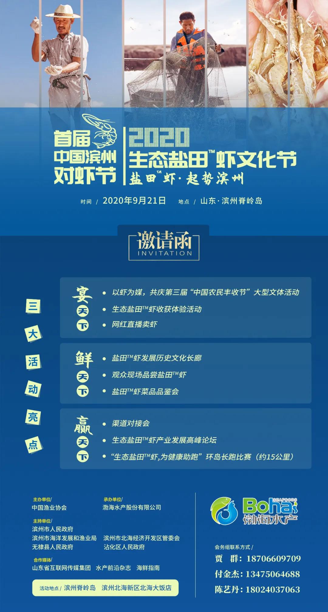 秋分時節,正是濱州鹽田™蝦豐收的季節。為進一步提升濱州水產品牌的社會影響力,提升“濱州鹽田™蝦”的產品價值,9月21日,“首屆中國·濱州對蝦節暨生態鹽田™蝦文化節”將在山東濱州脊嶺島隆重舉行。活動將邀請來自蝦業的養殖企業、供應商、進口商、經銷商、知名餐飲、商超和電商新渠道采購代表、協會機構、政府等行業代表共聚一堂,深入分析目前對蝦產業現狀,養殖端和消費端發展情況,對蝦行業的新增長點等眾多行業關注話題,為國產對蝦的品牌崛起助力。屆時,還將開展生態鹽田™蝦“捉、戲、品、觀”等活動,通過“美食+文化+旅游” 深入推動實施鄉村振興戰略注入新活力,有效提升濱州鹽田™蝦特色產業發展層次,更好地擦亮“生態鹽田™蝦”這張產業名片。