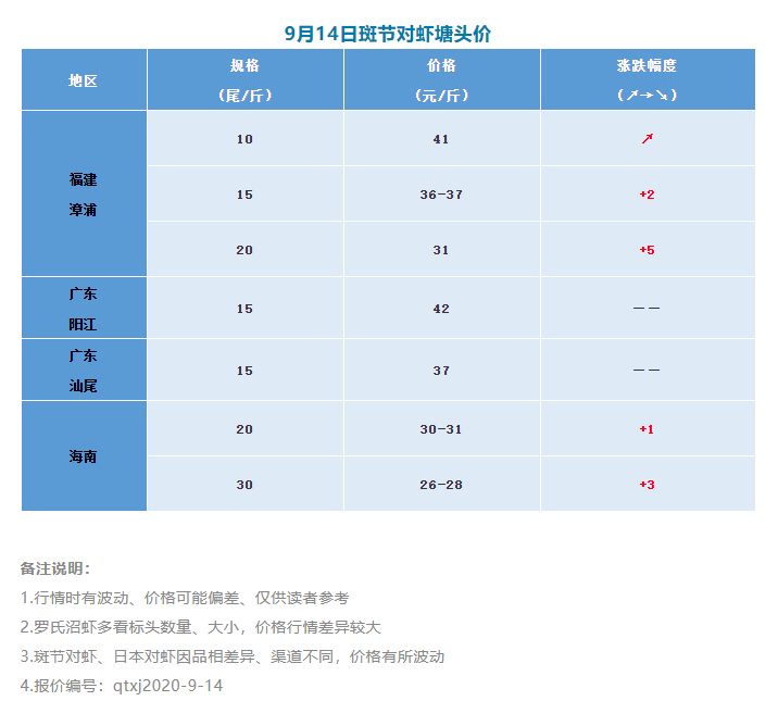 本周各地斑節(jié)對蝦漲勢明顯,其中福建地區(qū)上漲尤為突出,不僅10條、15條規(guī)格上漲2-3元,20條規(guī)格更是大漲5元。而土塘斑節(jié)對蝦方面,價格稍低,與高位池相差5元/斤左右。當?shù)貥I(yè)者表示,歷年農(nóng)歷8月都會有些影響,例如前段時間土塘發(fā)病和清塘多導致價格下跌。