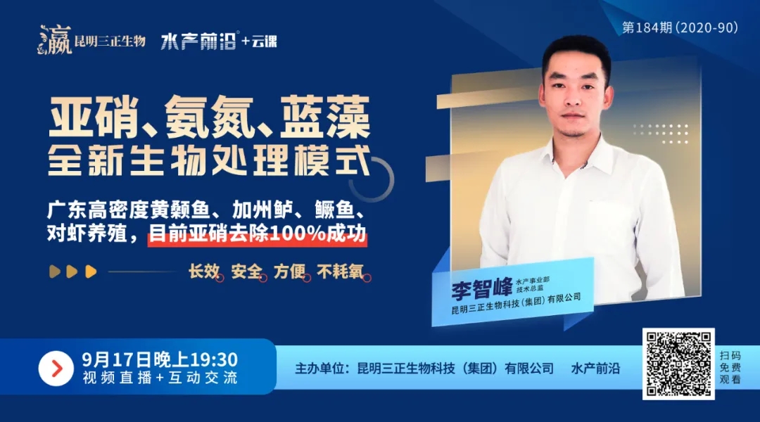 針對以上問題,9月17日晚上19:30,昆明三正生物科技(集團)有限公司(下稱“昆明三正”)攜手水產前沿+云課,特邀昆明三正水產事業部技術總監李智峰帶來《華南地區秋季水產養殖,氨氮、亞硝酸鹽全新生物處理模式》的主題分享。昆明三正集團經過數千案例的分析、研究,針對華南地區黃顙魚、鱖魚、對蝦等高密度池塘最終提出“生物活性底泥模式”,李總將為大家做詳細的講解,課上還設置了互動交流環節,精彩別錯過!