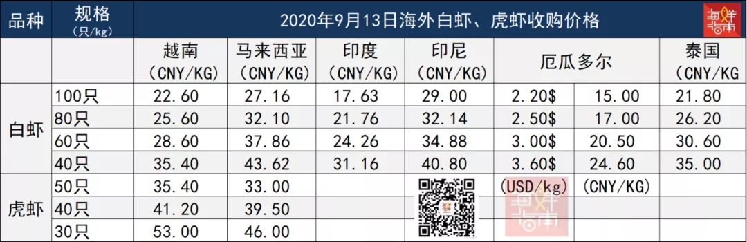 9月13日,與前一周相比,全球海外主產(chǎn)區(qū)厄瓜多爾大規(guī)格白蝦收購價(jià)繼續(xù)上漲,40/50每公斤上漲0.2$,至此行情已經(jīng)回調(diào)至3.6$/kg,逐漸回歸到正常的價(jià)值區(qū)間。