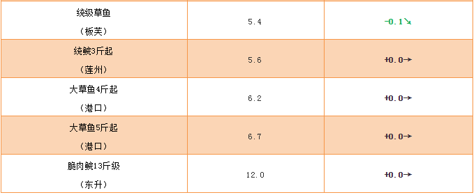 統(tǒng)鯇?zhuān)赫w價(jià)格保持穩(wěn)定,1.5斤價(jià)格在5.6元/斤,2斤價(jià)格在5.4-5.5元/斤;3斤上價(jià)格維持在5.6元/斤。