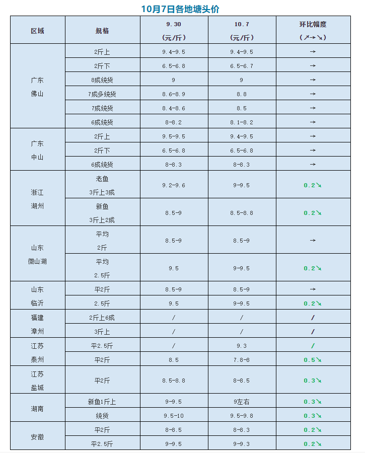 要聞1:新魚開始上市,國慶期間廣東抓魚活躍,但是新魚魚頭小,產量低,養殖戶不愿意出,3-6號經常不夠裝車量,省外出魚較為積極,價格有所下跌,特別是江蘇、浙江、安徽、山東的新魚,對老魚有一定的沖擊,魚價下跌明顯。本周江蘇、安徽、浙江、湖南、山東等地魚價都有下跌,最高下跌0.5元/斤,廣東價格稍微穩定。