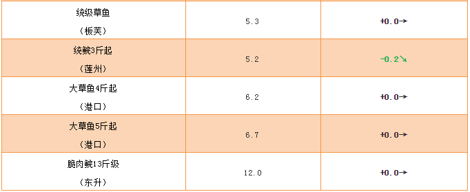統鯇:整體價格繼續回落,下跌0.1-0.2元/斤,1.5斤規格為5.4元/斤,2斤規格為5.2-5.3元/斤;3斤上規格為5.2元/斤。