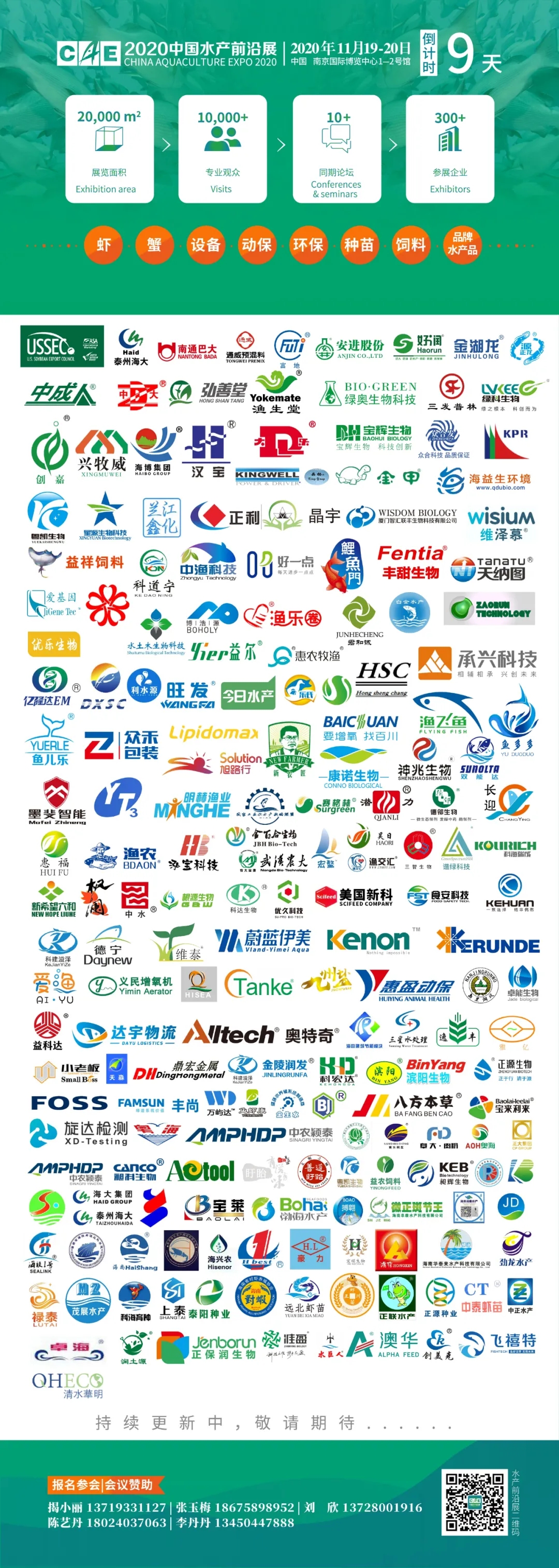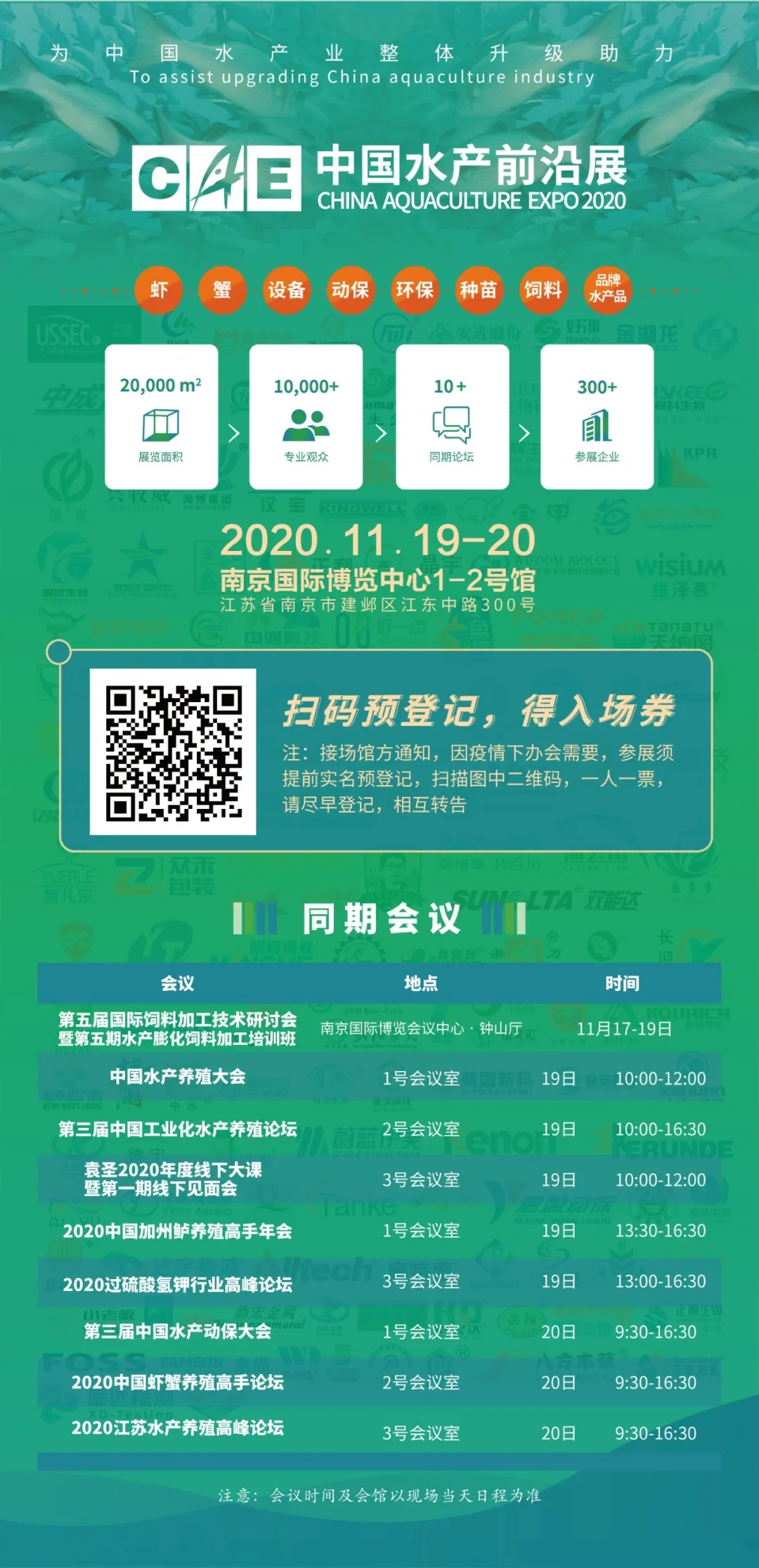 2020年11月19-20日,“2020'中國水產前沿展”將于中國·南京國際博覽中心1-2號館舉辦,20000㎡展覽面積,300+家行業優秀參展企業,10+場前沿論壇與洽談會,10000+專業觀眾……中國水產業者的年度嘉年華會,你怎能缺席!