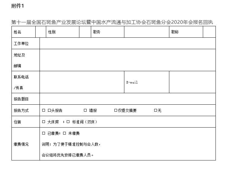 第十一屆全國石斑魚產業發展論壇暨中國水產流通與加工協會石斑魚分會2020年會報名回執