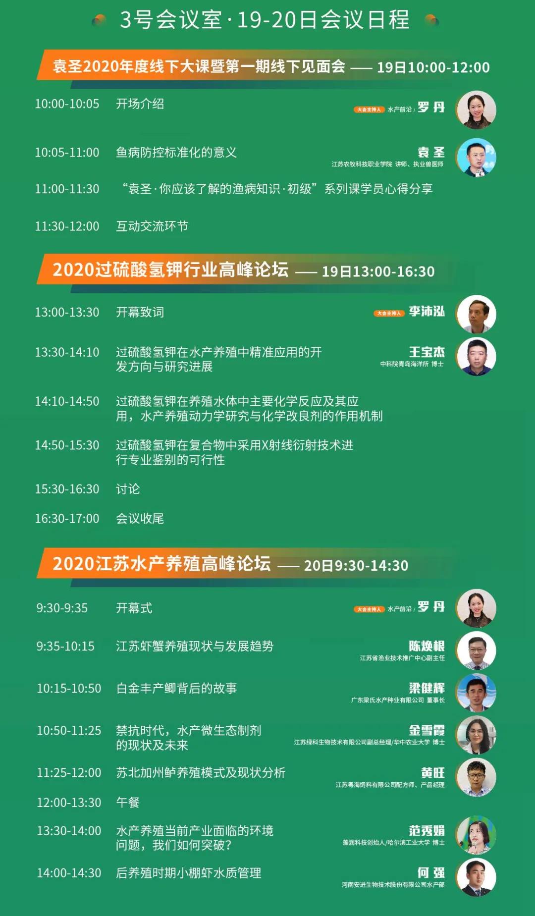 展會同期還將舉辦“2020中國水產養殖大會”、“第五屆國際飼料加工技術研討會暨第五期水產膨化飼料加工培訓班”、“第三屆中國水產動保大會”、“第三屆中國工業化水產養殖論壇”、“2020中國蝦蟹養殖高手論壇”、“2020中國加州鱸養殖高手年會”、“2020過硫酸氫鉀行業高峰論壇”、“2020江蘇水產養殖高峰論壇”、“袁圣2020年度線下大課暨第一期線下見面會”等前沿論壇與洽談會,為中國水產業整體升級助力!