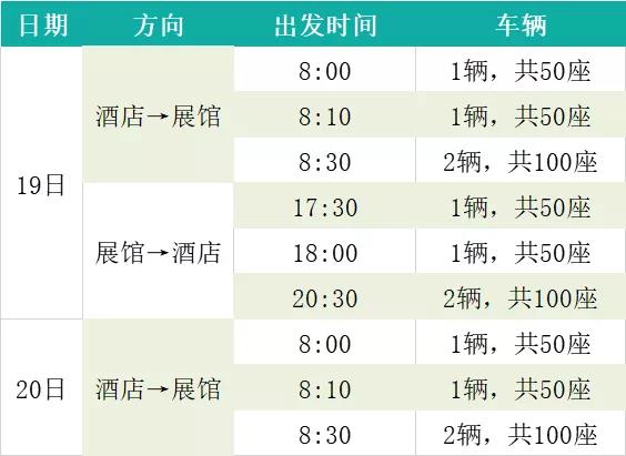 展會期間,協議酒店往返展館設有免費接駁大巴(50座/輛),接駁時刻表: