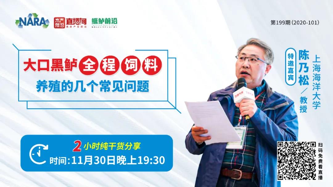 為探究具體原因,尋求解決方案,11月30日(周一)晚上19:30,鱖鱸前沿+云課特邀國家特色淡水魚產業體系淡水鱸營養與飼料崗位科學家、上海海洋大學陳乃松教授做客直播間,以視頻講解的形式在線分享《大口黑鱸全程飼料養殖的幾個常見問題》,將為大家一一解答:1、苗種培育期馴料難,成活率低;2、高溫期攝食率低,生長慢;3、肝膽綜合癥;4、 “老口魚”抗病力和成活率低;以及5、高溫期魚不耐起網和運輸等疑問。