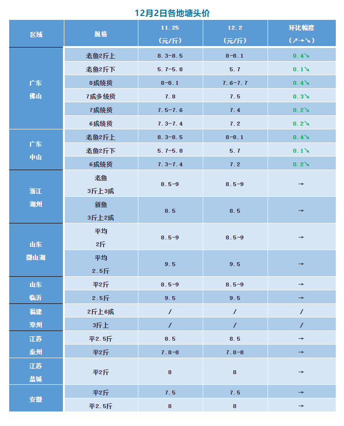 據(jù)悉,隨著氣溫下降,本周除廣東產(chǎn)區(qū)以外,其余山東、安徽、湖南、江蘇、福建、浙江等地的魚(yú)價(jià)基本上維持穩(wěn)定,其中特別是山東,基本上都很少出魚(yú)了,大部分養(yǎng)殖戶(hù)打算留塘更多雄(公)魚(yú),等明年開(kāi)春價(jià)格上漲時(shí)出售,故各個(gè)產(chǎn)區(qū)的養(yǎng)殖戶(hù)目前的出魚(yú)積極性很低,市場(chǎng)走貨反而有加快跡象,養(yǎng)殖戶(hù)以等價(jià)為主,對(duì)后市看好!