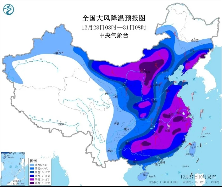 而這股寒潮的一個(gè)特點(diǎn),是這股寒潮在南下我國(guó)中東部的時(shí)候是相當(dāng)迅速的,按照目前超級(jí)計(jì)算機(jī)的預(yù)測(cè),僅僅在12月28日-12月30日期間,這股寒潮就要從塞北直接打到南海北部,迅速傾瀉而下的寒潮除了在我國(guó)中東部帶來(lái)猛烈降溫,也將帶來(lái)大范圍的強(qiáng)風(fēng)天氣。