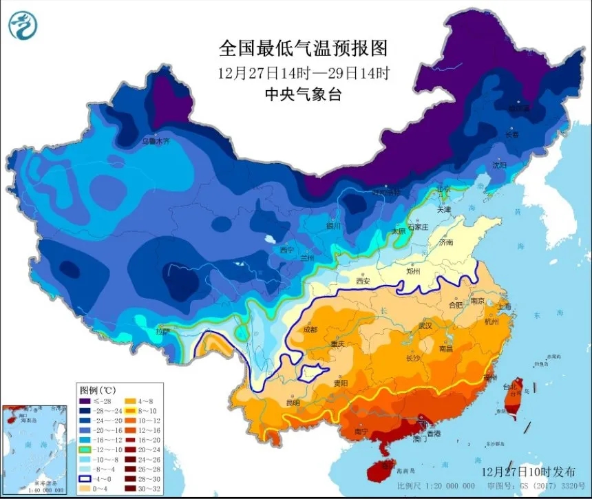 27日起,強(qiáng)冷空氣將自西向東、自北向南影響我國(guó)中東部大部地區(qū),帶來(lái)大風(fēng)和強(qiáng)降溫天氣。預(yù)計(jì)28日至31日,中東部大部地區(qū)氣溫將下降10℃左右,西北地區(qū)東部、東北地區(qū)東南部、華北西部和北部、黃淮南部、江淮、江南、華南中北部等地降溫12~16℃,局地降溫幅度可達(dá)16℃以上,上述地區(qū)將有4~6級(jí)、陣風(fēng)7~9級(jí)偏北風(fēng),我國(guó)東部和南部海區(qū)有7~9級(jí)、陣風(fēng)10~11級(jí)偏北風(fēng)(圖1);降溫過(guò)后,最低氣溫0℃線將南壓至華南北部一帶,最低氣溫-10℃線在黃河下游到秦嶺一帶(圖2)。
