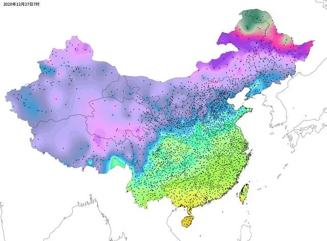 12月27日上午7點(diǎn),從整點(diǎn)氣溫圖上看,我國(guó)東北部地區(qū)的紫紅色中透出灰綠色,范圍比起之前還要更大了,這是我國(guó)東北部多地開始進(jìn)一步降溫的特征,這種特征說(shuō)明了,在西伯利亞堆積的巨量嚴(yán)寒氣團(tuán)開始南下。