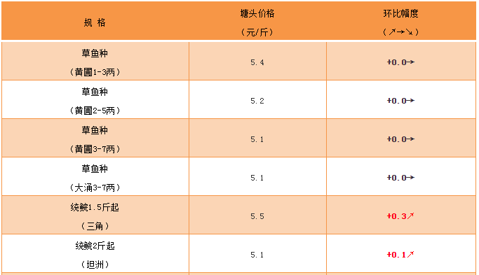 統鯇:本周行情走好,價格持續上漲,1.5斤規格上漲0.3元/斤,報價為5.5元/斤;2斤上規格上漲0.1-0.2元/斤,4.9-5.5元/斤;3斤上規格保持平穩,報價為5.3元/斤。