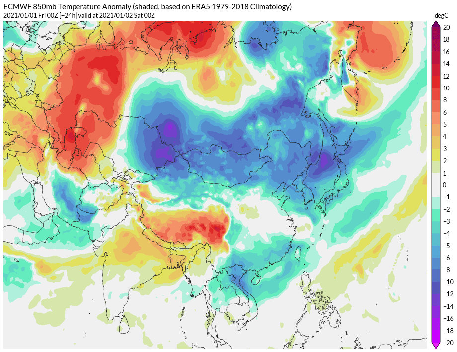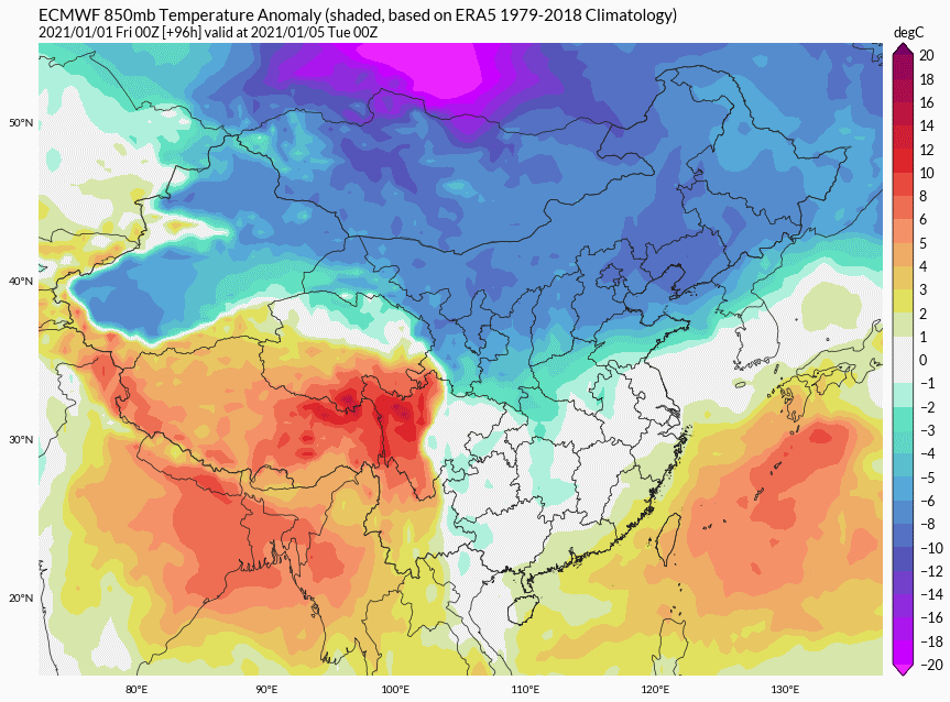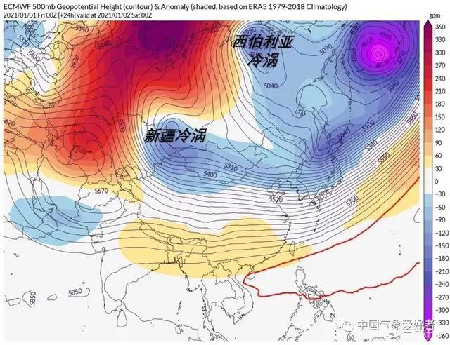然而在1月5日小寒節氣后,形勢發生變化。那個葉尼塞河的小冷渦,在持久的醞釀和發展中,來到了蒙古高原。這時,它已經實力強大,攜帶有大量極寒空氣,“冷源”強度甚至超過了2020年歲末寒潮。