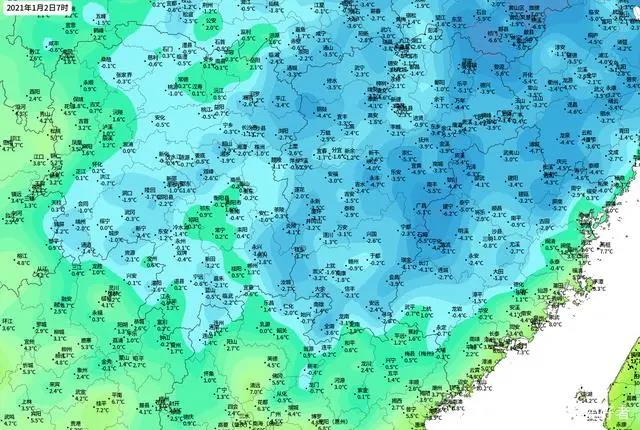 雖然我國的寒潮預警已經結束,代表著寒潮的影響在我國逐漸結束,但實際上,1月2日清晨,我國中東部地區還是出現了大范圍的寒冷天氣,從上午7點的整點氣溫圖上看,今天我國中東部地區的零度線(藍色區域)大舉向南推進,深入到長江以南地區。
