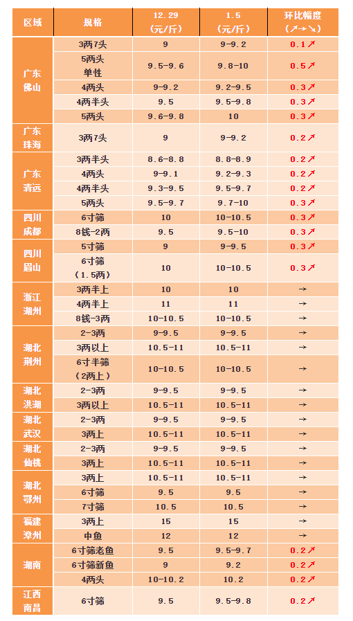 廣東清遠本周上漲0.3元/斤。情況和佛山類似,3兩半頭塘頭報價為8.6-8.8元/斤,主要看魚成數,成數高的魚塘價格可以出高點點,4兩半頭為9.5-9.7元/斤,5兩頭為9.8-10元/斤。