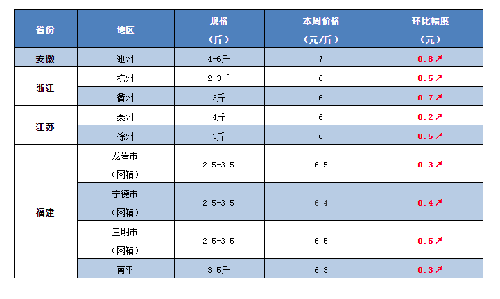 本周華東地區草魚塘頭價繼續強勢上漲,多地漲幅超過0.5元/斤,局部地區漲幅達到0.8元/斤。
