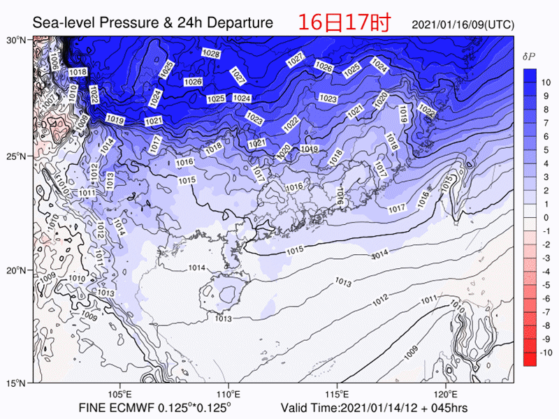 1月16日晚9點我國陸地溫度偏高/偏低情況,中氣愛制作