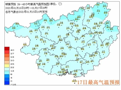 其中,17日,較強冷空氣的主體大舉南下影響全區,桂北的最高氣溫還將進一步下降,降至15℃左右,偏北地區甚至還將降至10℃左右,而其它地區的最高氣溫也將降至1字頭。