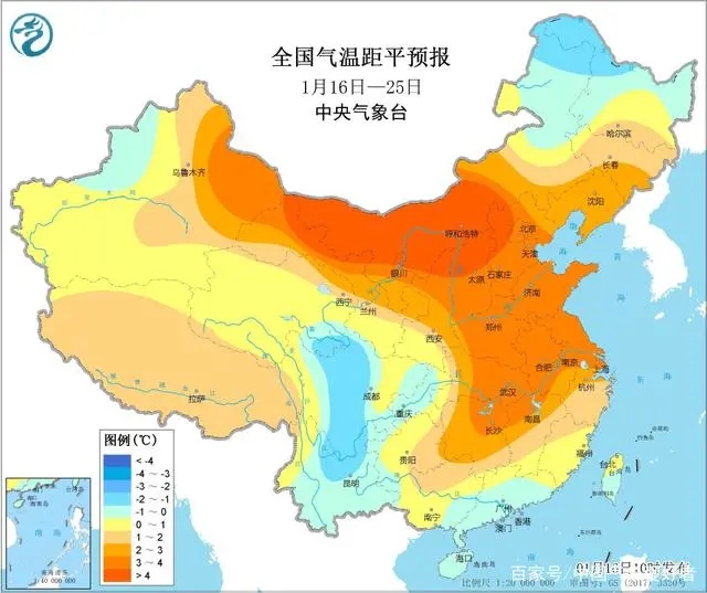 中央氣象臺的中期天氣預報中也指出,未來10天(1月16日-1月25日),除內蒙古東北部、黑龍江北部、四川盆地西部和云南中北部等地氣溫較常年同期偏低1~2度以外,我國其余大部地區氣溫較常年同期偏高1~3度,其中甘肅中北部、內蒙古中西部等地氣溫更是將偏高4度以上。