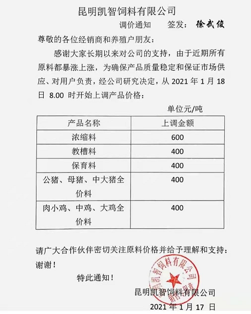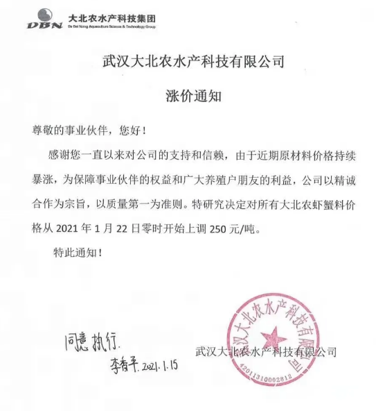 連日來,原料價格漲瘋了!2021年1月16日,豆粕已漲破4000元/噸,部分地區報價更是高達4670元/噸,破了歷史最高記錄4500元/噸,月漲幅超過1000元/噸。今天,飼料市場再次傳來料價瘋漲的消息,每噸最高上漲600元!水產料方面,漲得最猛的就是蝦蟹料。近日,水產前沿最新收到揚州通威、南通巴大、無錫通威、九江大北農、武漢大北農、湖南神爽以及荊州格力特等公司漲價龍蝦、螃蟹料消息。具體如下: