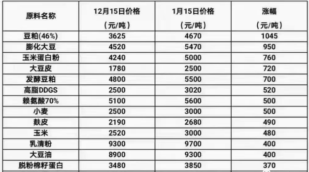 不瘋狂不成魔!過去的一年,乃至剛剛步入新的一年,飼料價格一直走在刷新歷史的路上...玉米突破1.5元回落后在攀高峰1.53元,豆粕出廠價達到4150元,賴氨酸、蘇氨酸市價創5年新高等,原料上漲飼料企業無奈只能跟隨,飼料漲價潮持續襲擊...有企業甚至一次大幅度上調600元。