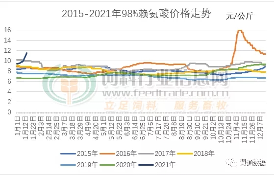 由于廠家發貨慢,賴氨酸、蘇氨酸、色氨酸市場供應偏緊,又值采購需求增加之時,報價大幅度上漲,截至目前,98%賴氨酸市場報價10.8-12元/公斤,70%賴氨酸市場報價5.5-6元/公斤,蘇氨酸市場報價14.5-16元/公斤,創5年來新高,色氨酸市場報價漲至66-70元/公斤。