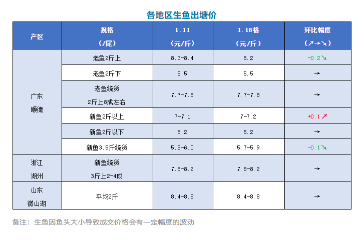 1、本周廣東生魚塘頭價格老魚2斤以上8.2元/斤,比上周下跌0.2元/斤;2斤以下報價5.5元/斤,保持不變;老魚統(tǒng)貨2斤上8成左右報價7.7-7.8元/斤,跟上周一樣;新魚3.5斤統(tǒng)貨5.7-5.9元/斤,比上周下跌了0.1元/斤;新魚2斤上報價7-7.2元/斤,比上周上漲了0.1元/斤;2斤以下報價5.2元/斤,跟上周一樣;每塘魚的最終成交價格都是根據(jù)魚頭大小以及2斤以上成數(shù)來決定的。天氣雖轉(zhuǎn)冷,但受疫情影響,北方市場走量并無顯著提升,目前大魚和中魚價錢趨于平穩(wěn),塘頭開魚以及裝車價并無太大波動,新魚魚頭有4.5斤上的更好走,價稍高。各地政府皆出臺疫情應對政策,春節(jié)魚價仍然一片迷霧。