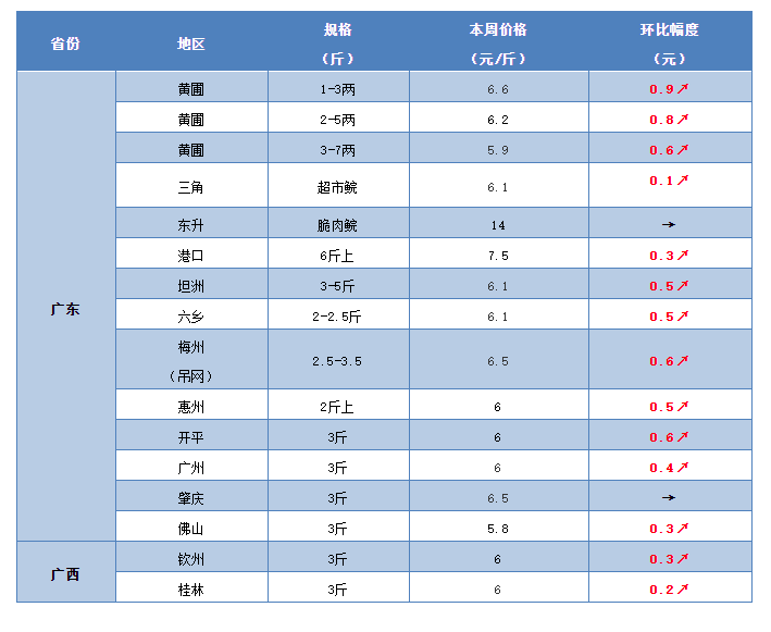 本周華南地區草魚行情繼續保持明顯的上升勢頭,價格行情出現大面積飄紅,局部地區漲勢喜人。