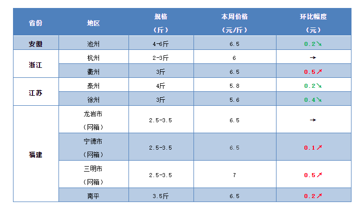 本周華東地區的草魚整體行情繼續保持上漲趨勢,尤其福建、浙江等地漲勢喜人,不過安徽、江蘇有部分地區出現回落現象。