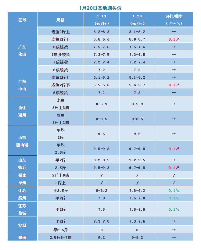 本周多個品種魚價上漲:本周黃顙魚部分區域漲0.3元/斤,廣東草魚統貨塘頭價達到6.8元/斤,羅非魚暴漲1元/斤,加州鱸魚、江團維穩,鱖魚微漲0.2元/斤,近期由于疫情不穩定,多地禁止酒席,個別品種價格波動,臨近寒假,生魚價格來回擺動,到底能不能漲一波,賺點錢過好年,歡迎留言區評論。