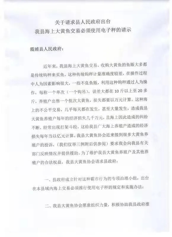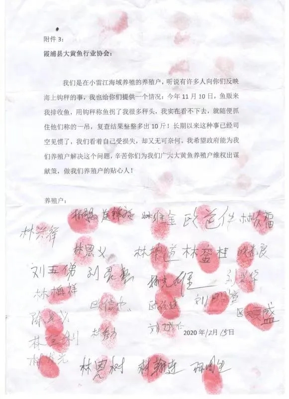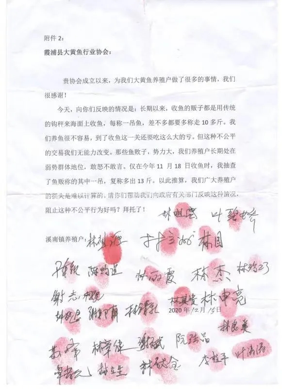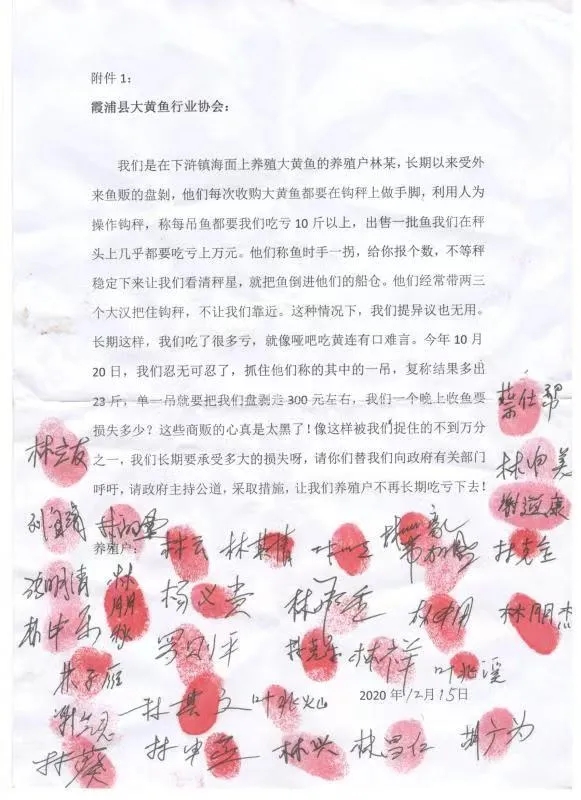 據(jù)了解,霞浦當(dāng)?shù)亟儆鄳?hù)養(yǎng)殖戶(hù)聯(lián)合起來(lái)向當(dāng)?shù)卮簏S魚(yú)行業(yè)協(xié)會(huì)上書(shū),請(qǐng)求保障養(yǎng)殖戶(hù)的利益,下圖是下滸鎮(zhèn)、溪南鎮(zhèn)、小雷江海域的大黃魚(yú)養(yǎng)殖戶(hù)的聯(lián)名信。