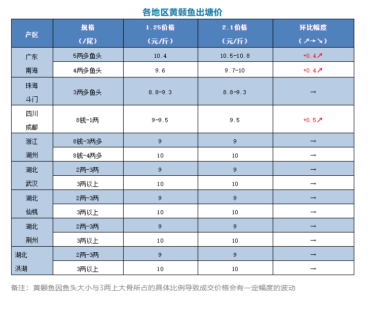 本周廣東黃顙魚大規格魚小幅上漲,小規格保持不變,5兩多魚頭報價10.5-10.8元/斤,比上周上漲0.4元/斤;4兩多魚頭報價9.7-10元/斤,比上周上漲了0.4元/斤;3兩多魚頭8.8-9.3元/斤,跟上周一樣。節前銷量慢慢多起來了,外省水車到本地裝魚也有所增加,價格或有望進一步上漲。