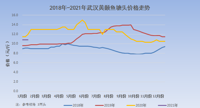 2018-2021年湖北武漢3兩上黃顙魚成品魚價格走勢