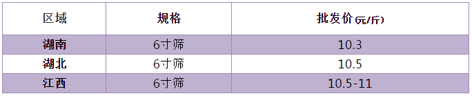 江西南昌本周價格微漲。本地出魚不多,市場走量暢銷,年前銷量對比之前有所增加,日走貨量為3萬斤左右,目前6寸篩批發價為10.5-11元/斤,6寸篩塘頭價為10-10.5元/斤,業內表示按照往年規律接下來預計會漲價。