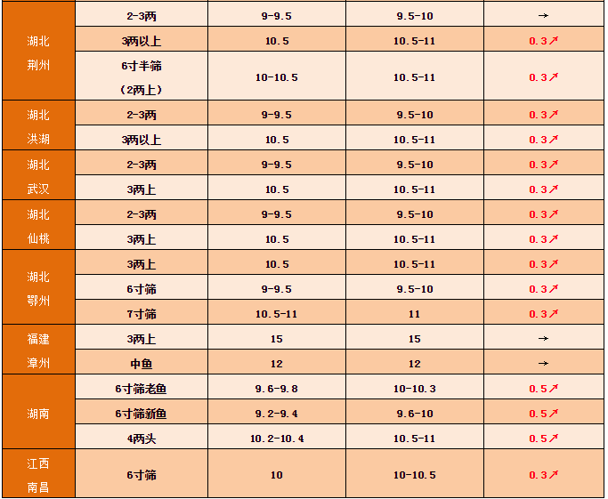廣東清遠本周價格上漲0.2元/斤。情況和佛山類似,3兩半頭塘頭報價為9.5元/斤,主要看魚成數,成數高的魚塘價格可以出高點點,4兩半頭為10.5-11元/斤,5兩頭為11-11.3元/斤之間。