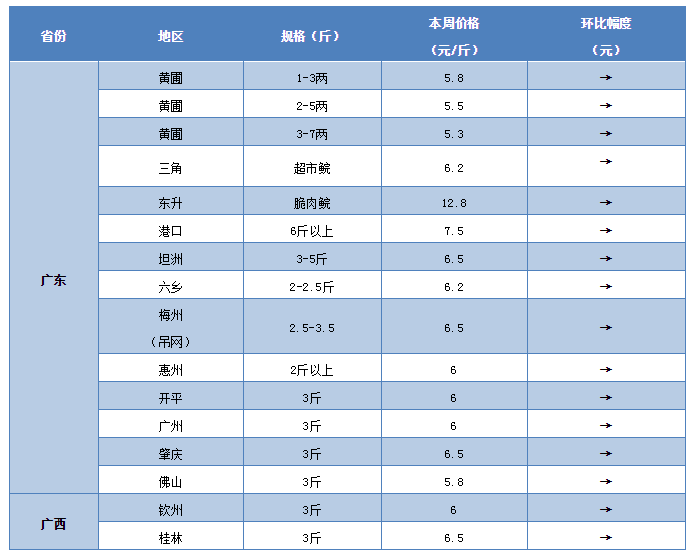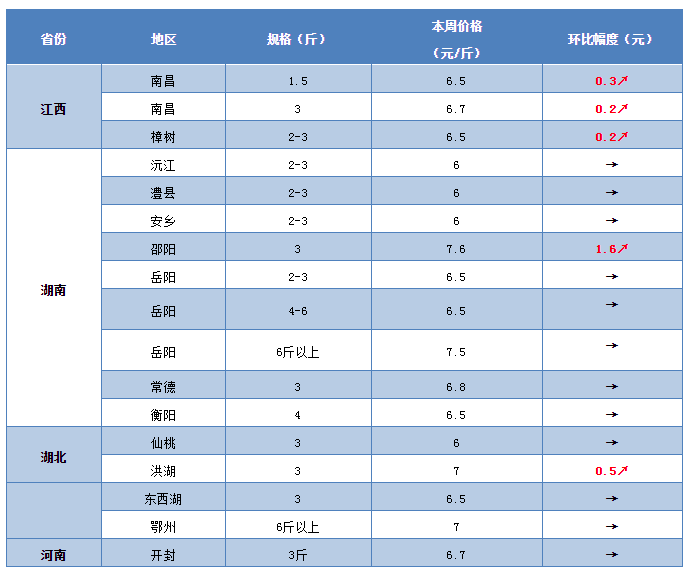 福建:本周福建地區的草魚行情再次出現一波明顯上漲。據養殖戶介紹,目前南平地區3斤的草魚塘頭賣6.7元/斤,較上周上漲0.3元/斤;閩江地區3斤的草魚賣6.6元/斤,3.5斤以上的賣6.8元/斤,較上周上漲0.2元/斤;三明地區3斤左右的草魚塘頭賣6.5元/斤,繼續維持上周水平。
