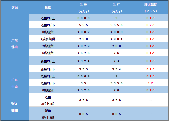 廣東佛山本周上漲0.1元/斤。春節(jié)期間,市場(chǎng)需求量猛增,流通商不夠魚(yú)抓廣東生魚(yú)價(jià)格急速上漲,2.5斤上大魚(yú)發(fā)車(chē)價(jià)達(dá)到10元/斤。近兩天開(kāi)始有點(diǎn)浮動(dòng),大魚(yú)微跌,中魚(yú)升價(jià)。目前新魚(yú)2斤上裝車(chē)價(jià)7.5-7.6元/斤,2斤下發(fā)車(chē)價(jià)為5.6-5.8元/斤,2斤上塘頭價(jià)為7.4元/斤,2斤下塘頭價(jià)5-5.3元/斤,2斤上6成統(tǒng)貨6.5元/斤左右,主要看魚(yú)頭,魚(yú)頭越大訂價(jià)越高,老魚(yú)大魚(yú)深受市場(chǎng)喜愛(ài)。目前棚魚(yú)為市場(chǎng)主力,統(tǒng)貨價(jià)在7.3-7.6元/斤之間,舊魚(yú)2斤上塘頭價(jià)8.8-9元/斤之間,裝車(chē)價(jià)9.3元/斤,加工廠逐步開(kāi)工,2斤下的中魚(yú)魚(yú)價(jià)上升,塘頭價(jià)5.5-5.6元/斤,老魚(yú)2斤上8成塘頭價(jià)7.8-8.3元/斤,2斤上7成多統(tǒng)貨7.8-8.1元/斤,2斤上6成統(tǒng)貨7.5-7.6元/斤。業(yè)界表示今年春節(jié)控制穩(wěn)定,加工廠復(fù)工,中魚(yú)帶動(dòng)魚(yú)價(jià),養(yǎng)殖戶在魚(yú)散春前基本不會(huì)怎么賣(mài)魚(yú),后續(xù)看漲!