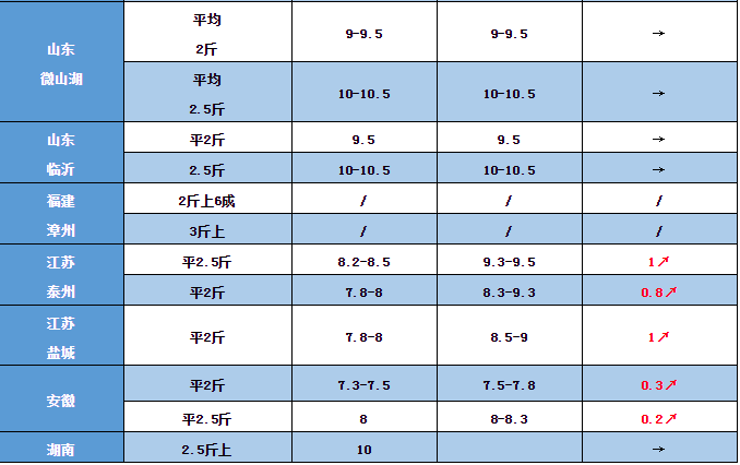安徽本周價(jià)格微漲0.3元/斤。當(dāng)?shù)仞B(yǎng)殖戶出魚(yú)積極性一般,目前平1.6斤的魚(yú)塘頭價(jià)7-7.5元/斤,平2斤塘頭價(jià)為7.5-8元/斤,平2.5斤上8-8.3元/斤,價(jià)格波動(dòng)較大,主要是看魚(yú)的質(zhì)量。