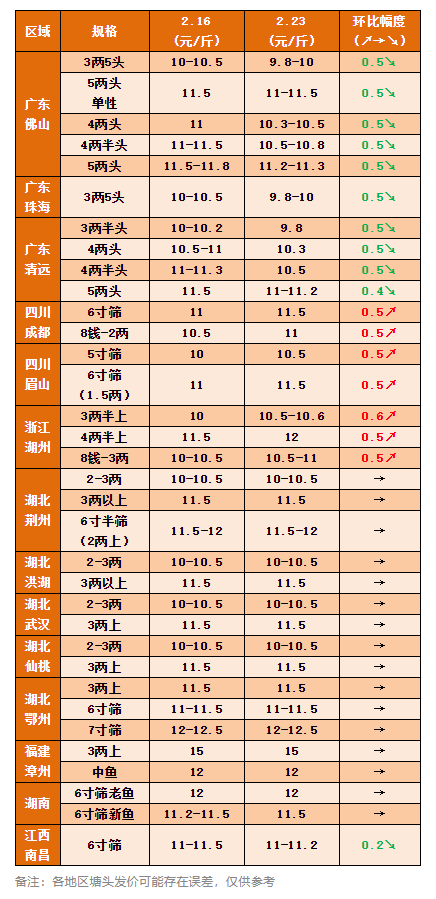要聞1:本周魚價有跌有漲,最高0.5元/斤!四川、浙江部分區域存量少,養殖戶惜售,市場價格上漲。而廣東地區由于天氣回暖,地理優勢逐步不明顯,多地魚車會本地抓魚,到廣東抓魚的減少,另外由于各地開始各自出魚,廣東往外走的魚也受到影響,魚價下跌,養殖戶開始惜售!其余產區價格維穩。