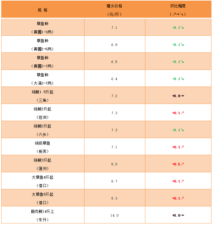 草魚:魚種略有回落、統鯇、大草魚上漲