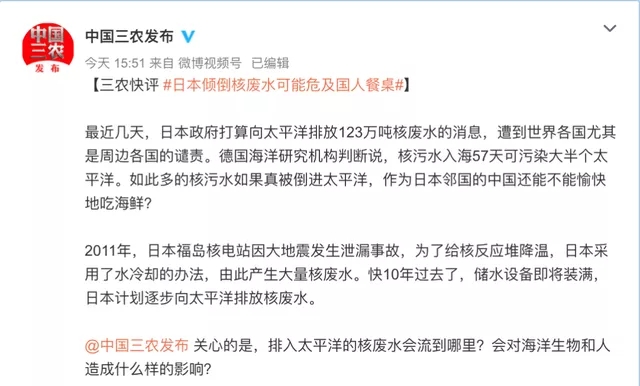 觀點三:日本傾倒核廢水可能危及中國人餐桌