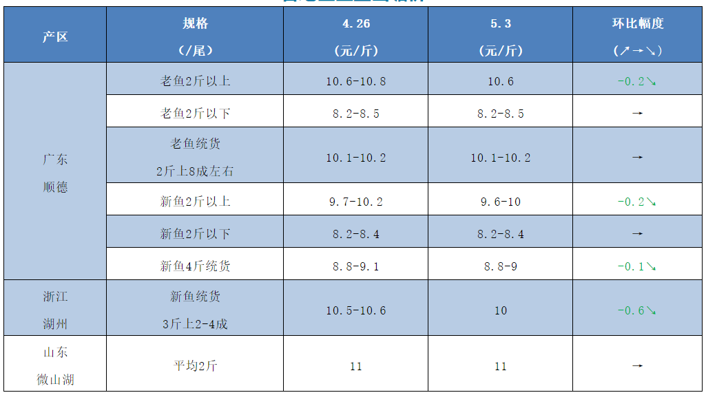 中國水產頻道原創報道,1、本周廣東生魚老魚2斤以上10.6元/斤,比上周下跌了0.2元/斤;2斤以下報價8.2-8.5元/斤,保持穩定;老魚統貨2斤上8成左右報價10.1-10.2元/斤,跟上周一樣;新魚4斤統貨8.8-9.0元/斤,比上周下跌0.1元/斤;新魚2斤上報價9.6-10.0元/斤,比上周下跌0.2元/斤;2斤以下報價8.2-8.4元/斤,跟上周一樣。
