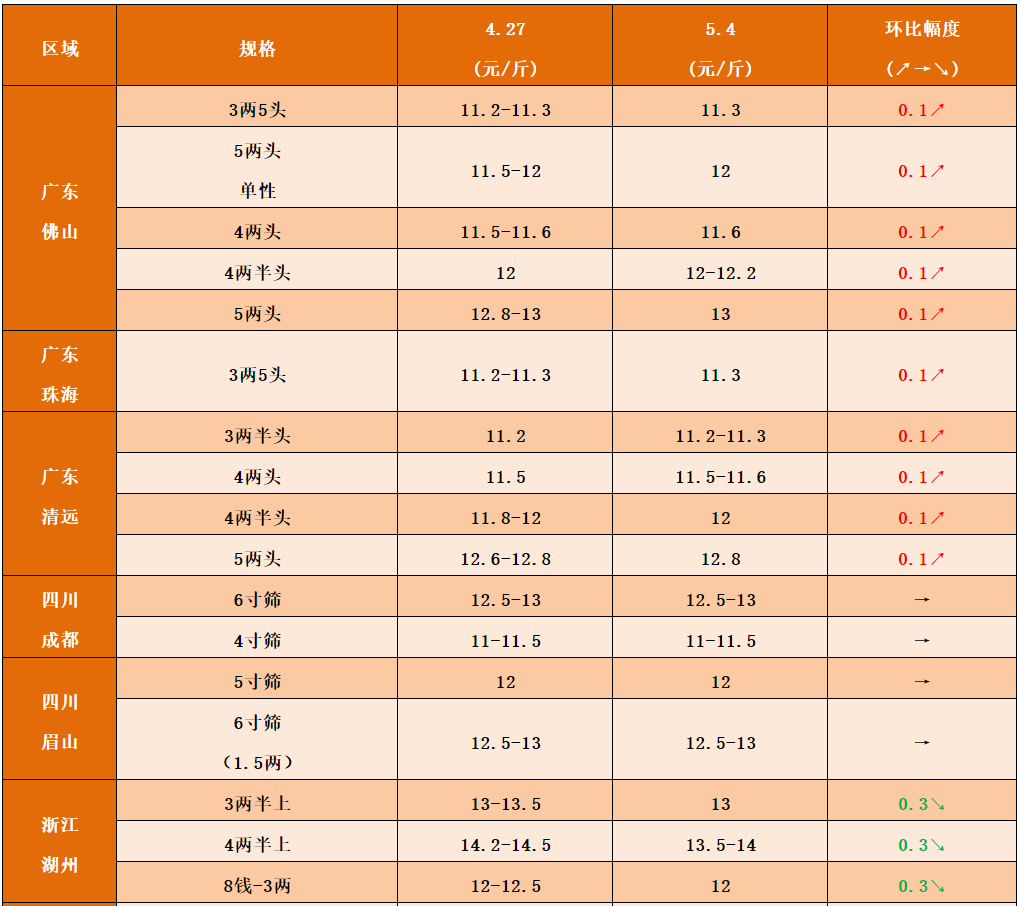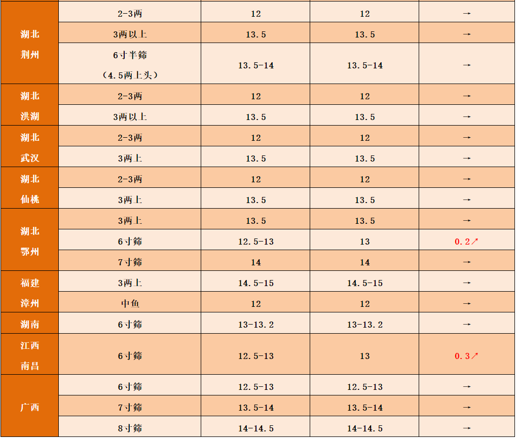 江西南昌本周價格上調0.3元/斤。五一期間,市場銷量增加,大規格魚價格上漲了點,市場價為13.5元/斤,6寸篩好魚塘頭價為13元/斤左右。養殖戶出魚順暢,小規格魚價格穩定。