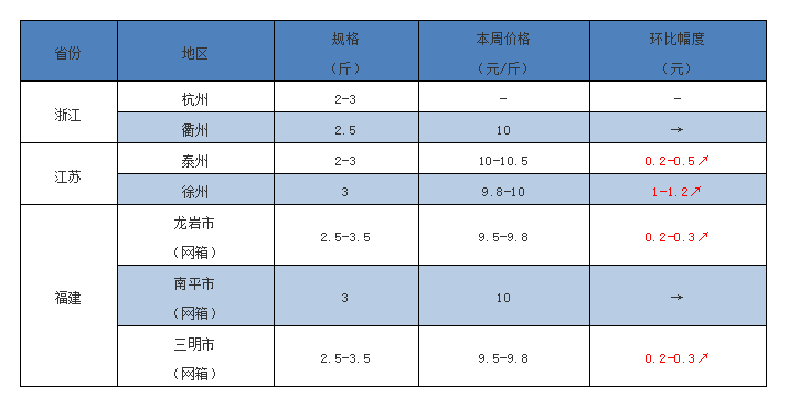 福建:規格緊缺,養戶賣魚意愿低,行情穩中有漲。龍巖水庫網箱可上市存魚不多,2.5-3.5斤報價9.5-9.8元/斤,環比上周上調0.2-0.3元/斤。三明水庫網箱規格魚不多,交易量小,本周報價9.5-9.8元/斤,環比上周上調0.2-0.3元/斤。南平閩江地區水庫網箱尚有一些規格魚,3斤上報價維持10元/斤,以本地銷售為主,走量不多;外省魚車裝2斤上規格9.7元/斤,銷量相對較大。