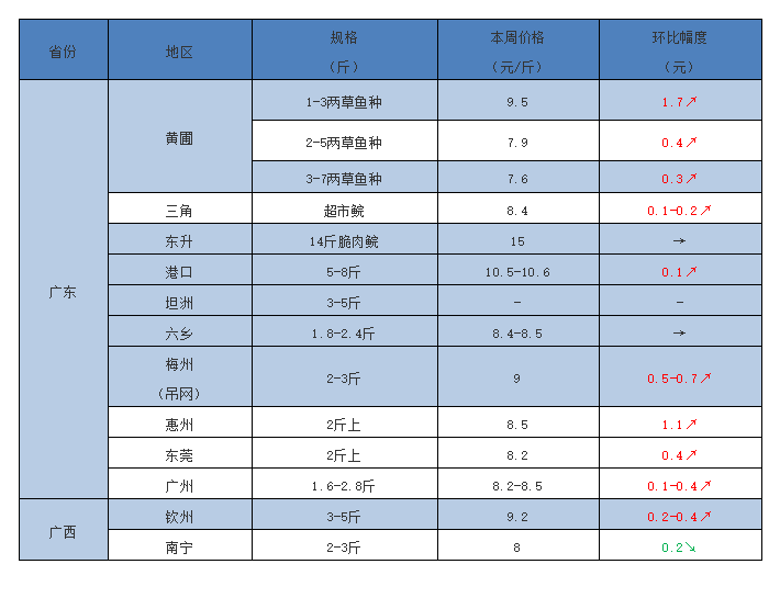 湖南:常德存塘大規格魚不多,1.5斤起均重2.8斤10元/斤,環比上周上調0.5元/斤;少量3斤上規格報價亦維持10元/斤;1-5兩草魚苗9.5-10元/斤。