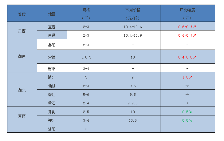 江西:成品魚有價無貨。宜春與南昌2-3斤規格10.4-10.6元/斤,環比上周皆上調0.6-0.7元/斤;南昌周邊10尾/斤苗價11元左右,但基本沒有供應量,維持平穩。